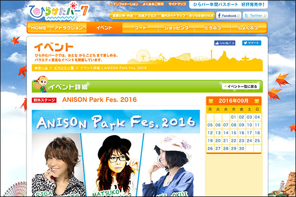 ひらかたパークで「ANISON Park Fes. 2016」というイベントが開かれるようです。