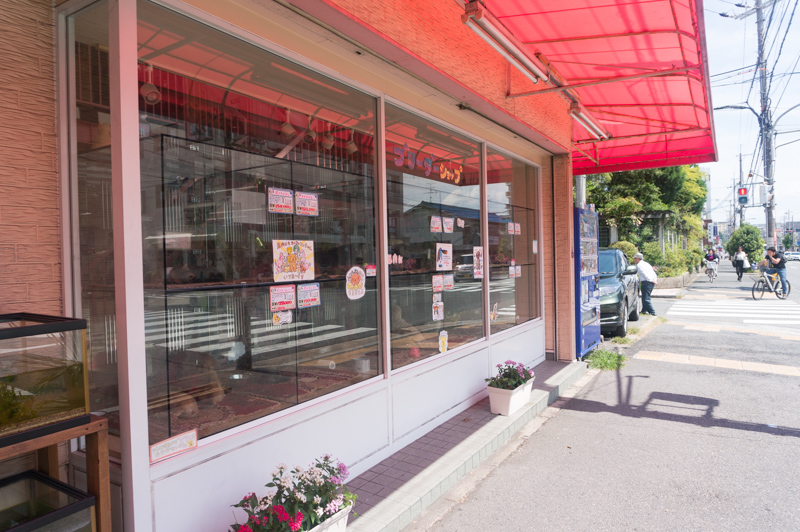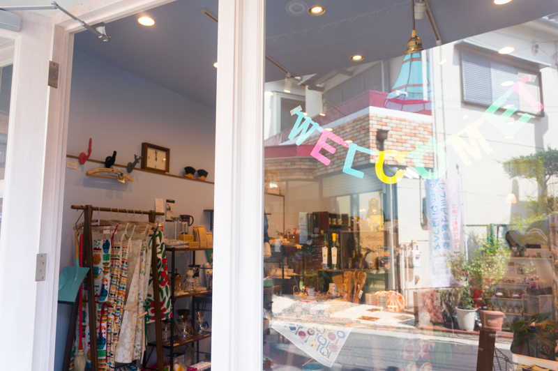 ガラス張りの大きな窓から色とりどりの雑貨が見えます
