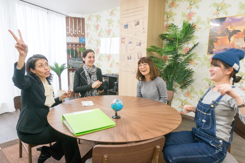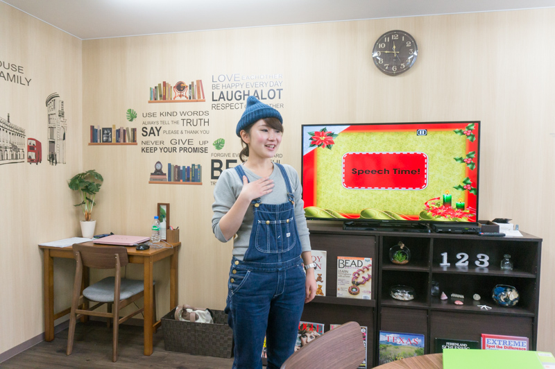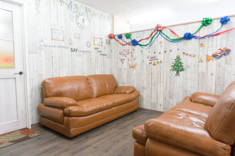 英会話教室のイメージって、一人一人机と椅子に座って、先生がホワイトボードの前に立って・・・と想像してたけど、すごいアットホーム。いつでも来てソファに座ってゆっくりしていって!という雰囲気があるから、生徒同士の会話も弾みそう♪
