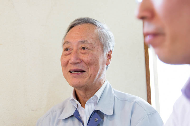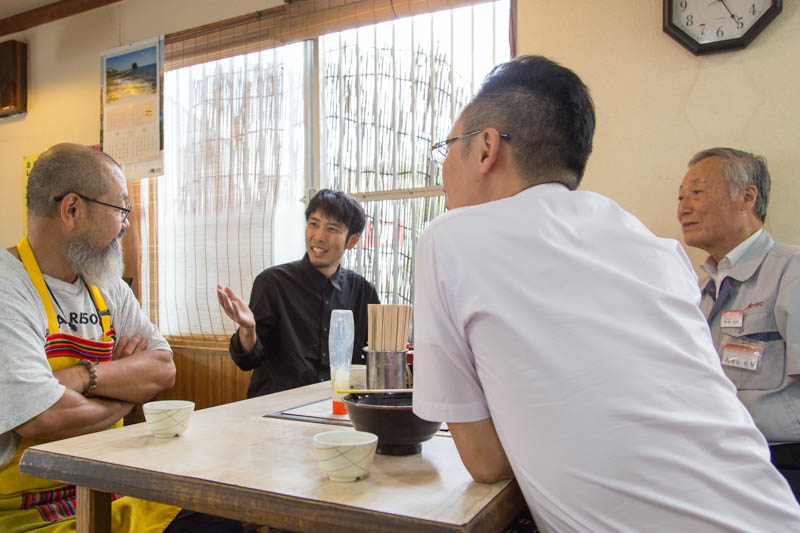 写真右奥が社長の芦田庄司さん、右手前が息子で専務の知之さん、そしてお話を聞くのは左奥のシュン@ひらつーです。