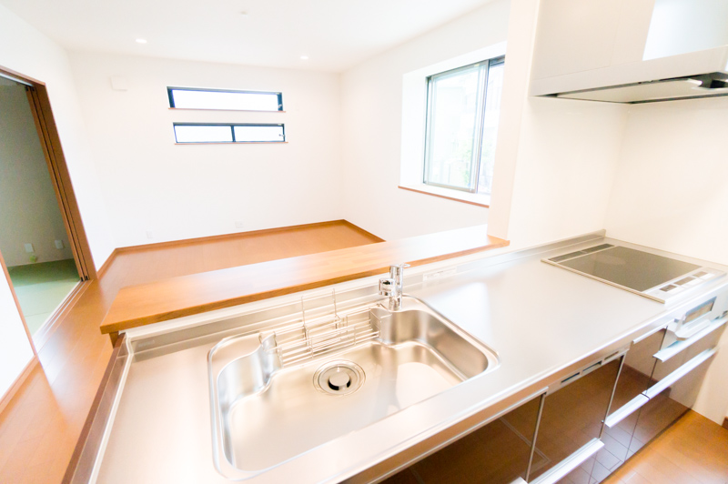 IHクッキングヒーター・調理台とシンクに隙間がない「スキマレスシンク」が並ぶキッチンです。フラットなデザインとなっているので、拭き掃除もしやすくなっていますよ。