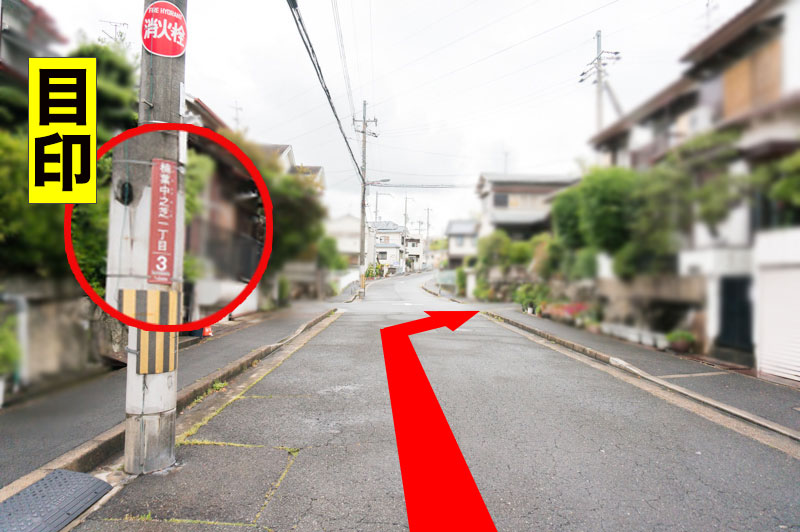 道なりに進んでいくと左側に電柱「楠葉中之芝1丁目」が見えてくるので、次の十字路を右折してすぐのところです。
