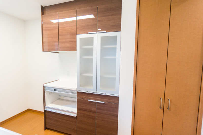 キッチンの後ろには天井まである耐震性のカップボードがあり、万が一地震が起きたときには扉にロックがかかり食器の落下を防ぐことができます。