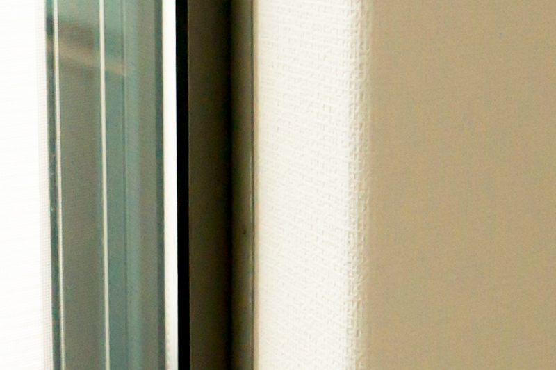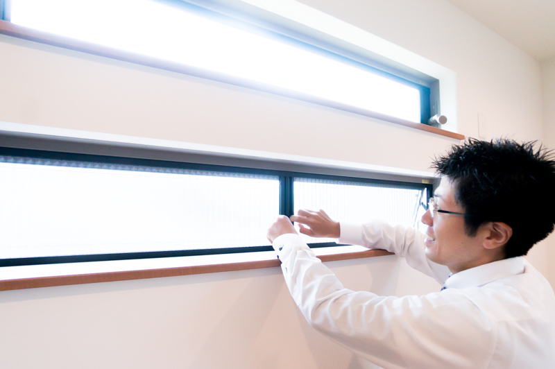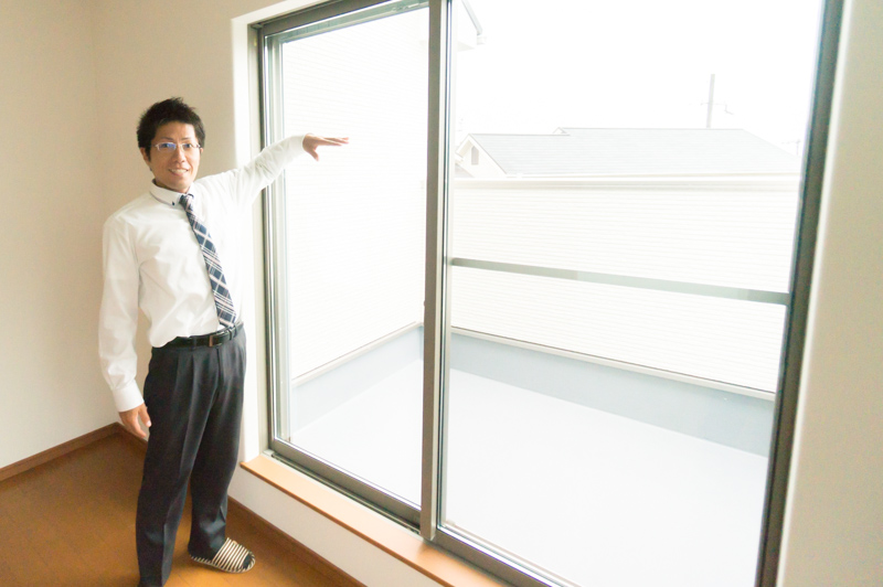 こちらの窓はLow-E複層ガラスで断熱性も良く、薄くエメラルドグリーンの色がかかっているので外からお部屋が見えにくくなっています。