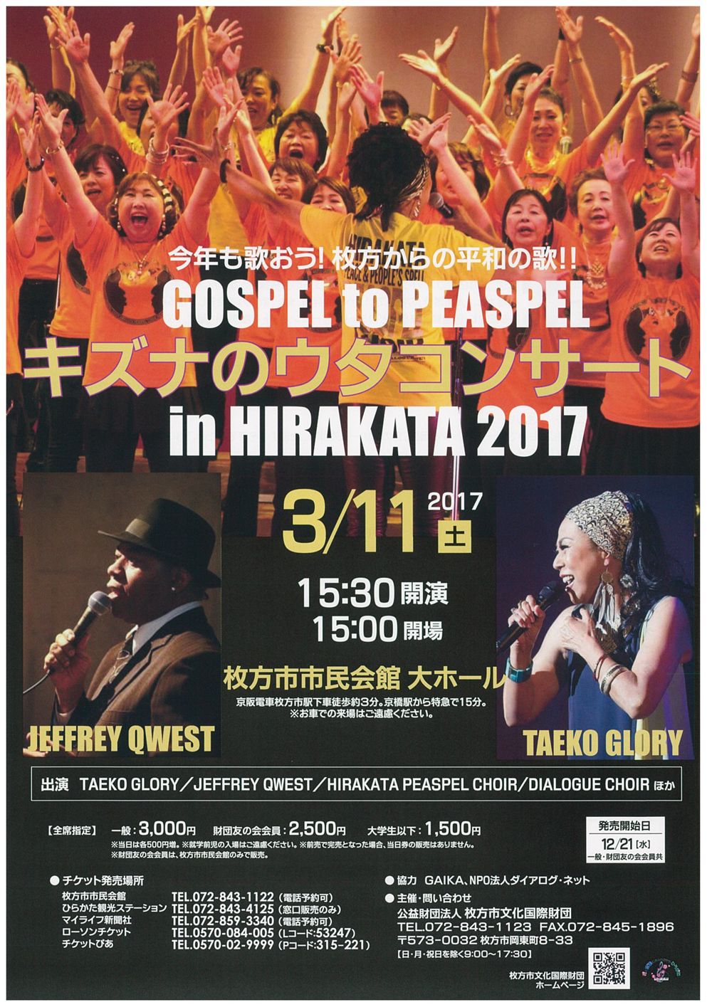 昨年も同時期に「GOSPEL to PEASPELキズナのウタコンサート in HIRAKATA」のご招待をしました。(ひらつープレゼント企画!枚方市市民会館3/13(日)GOSPEL to PEASPEL「キズナのウタコンサート」にご招待!)