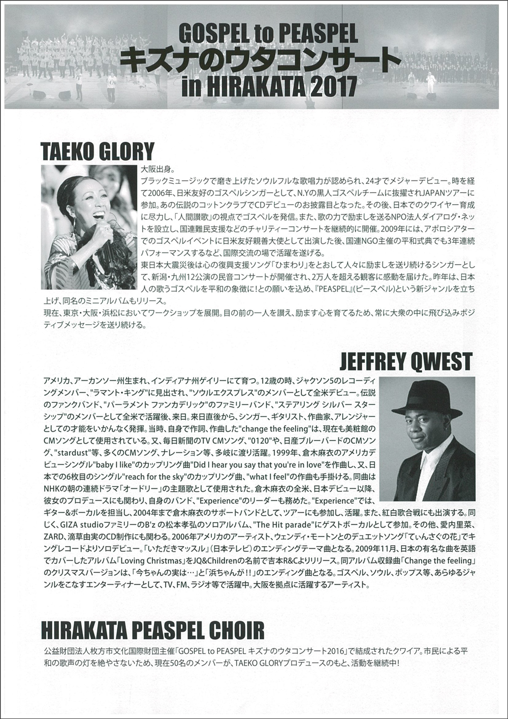 出演:TAEKO GLORY、ジェフリー・クエスト、枚方PEASPEL CHOIR、DIALOGUE CHOIRほか