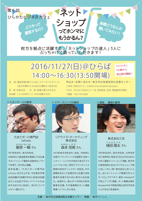 今年度、第6回目になる「ひらかたビジネスカフェ」。今回は枚方を拠点にネットショップを運営されている3名のゲストをお迎えしてお話を伺いました。