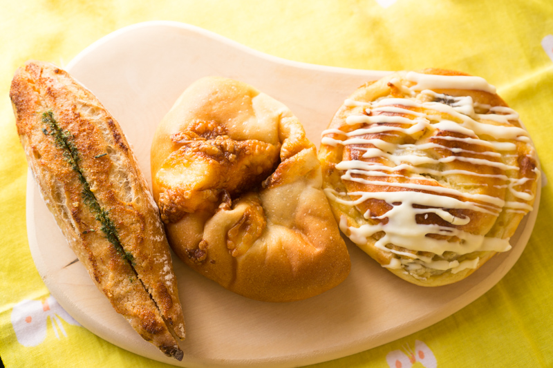 食パン、全粒粉クロワッサン、あんパン、焼きカレーパン、野菜のチャバタ、リュスティック、ベーコンエピ他