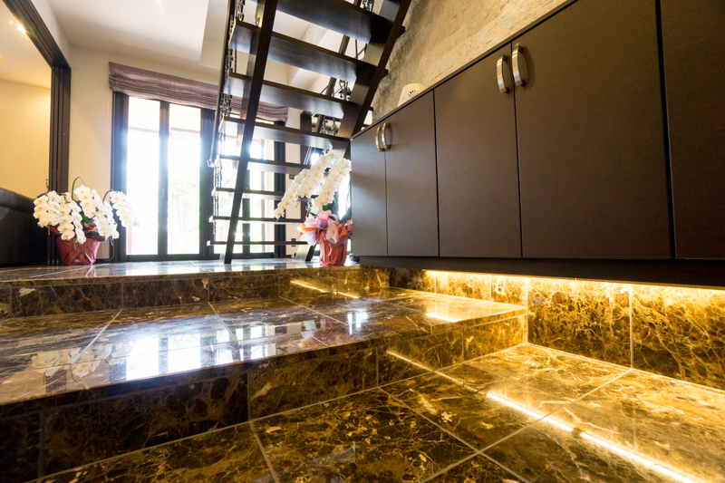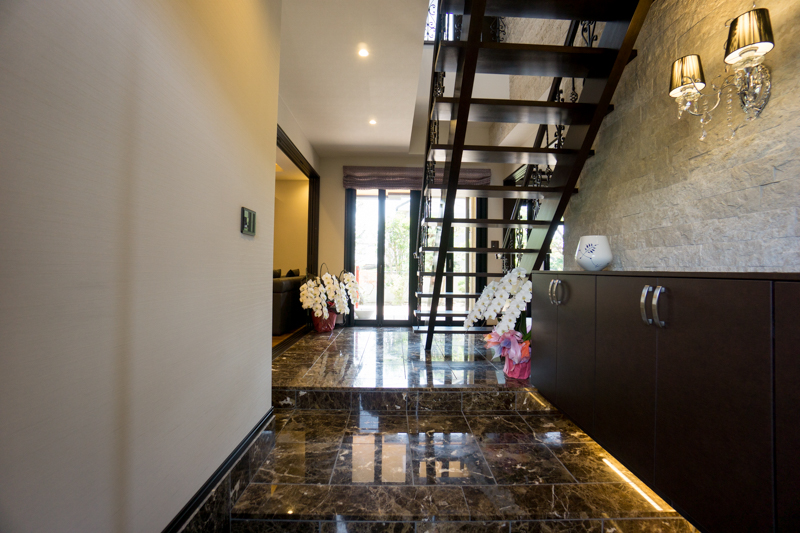 そう、玄関ホール一帯に大理石が敷き詰められていて、靴を脱ぐ場所が分からない ふろとカトゥー。