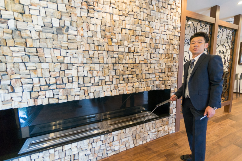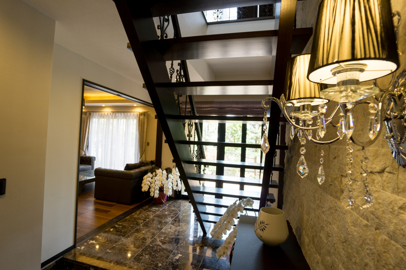 「暖炉まわりの木石から、金色の和紙を使った天井クロス。そして、このトイレのステンドグラスなど、適所にいいアクセントが効いてますね!」