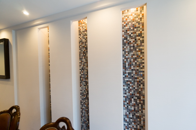「ちなみにリビング内奥には、縦に凹凸のある3つのラインのアクセントとして、平田タイル ガラスモザイク『ピグメント』を貼っています。」