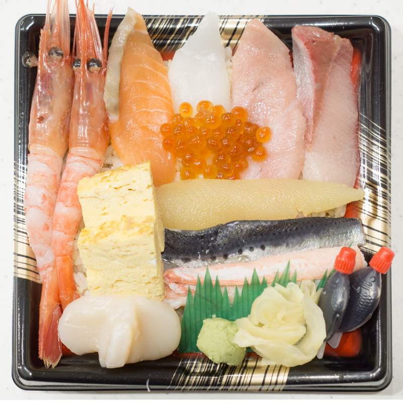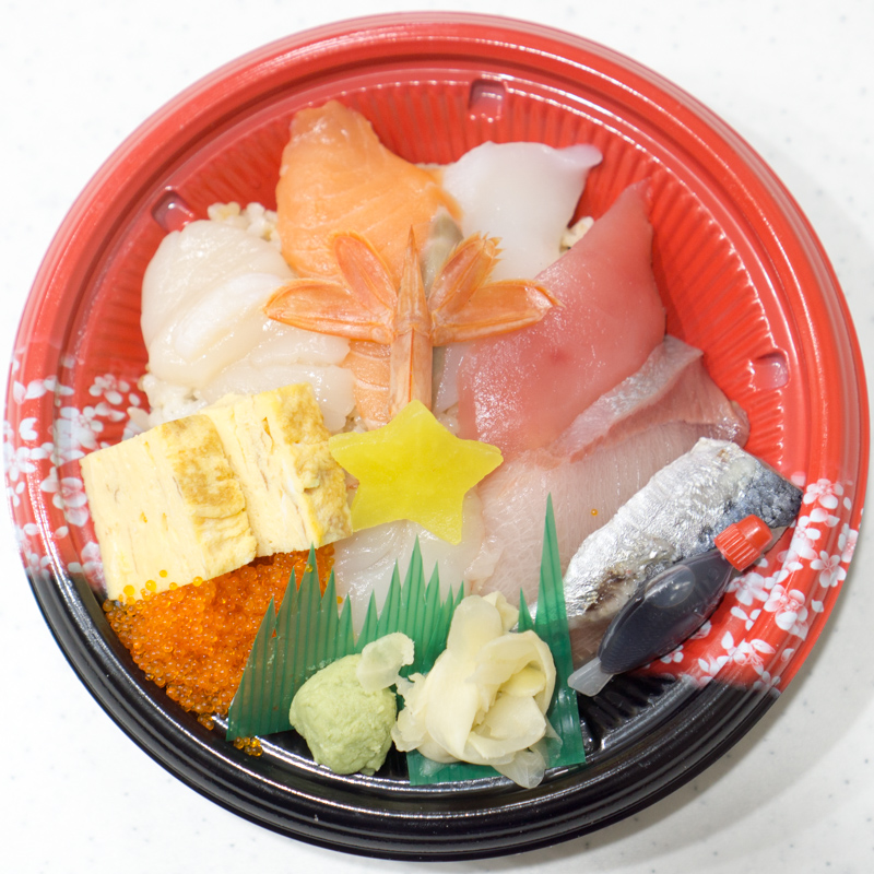 ハマチ・マグロ・イカ・サーモン・生赤エビ・いわし・とびこ・職人手作り厚焼き玉子 + ホタテ(期間限定)・ぼしひこくんお新香(期間限定)