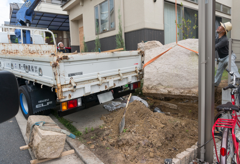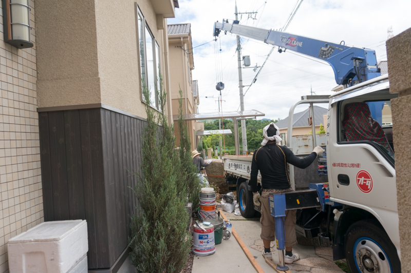 ちなみに、庭にあった足場となる縁石も、矢印のようにユニック車で吊り上げて、移動させています。