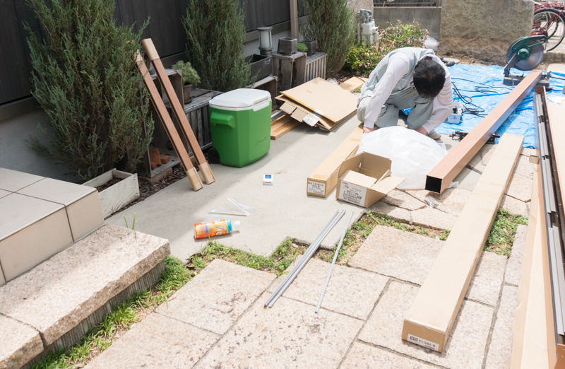 植栽や敷いていた芝をとった後は、いよいよ大きな屋根付きのテラスの設置に取り掛かります。