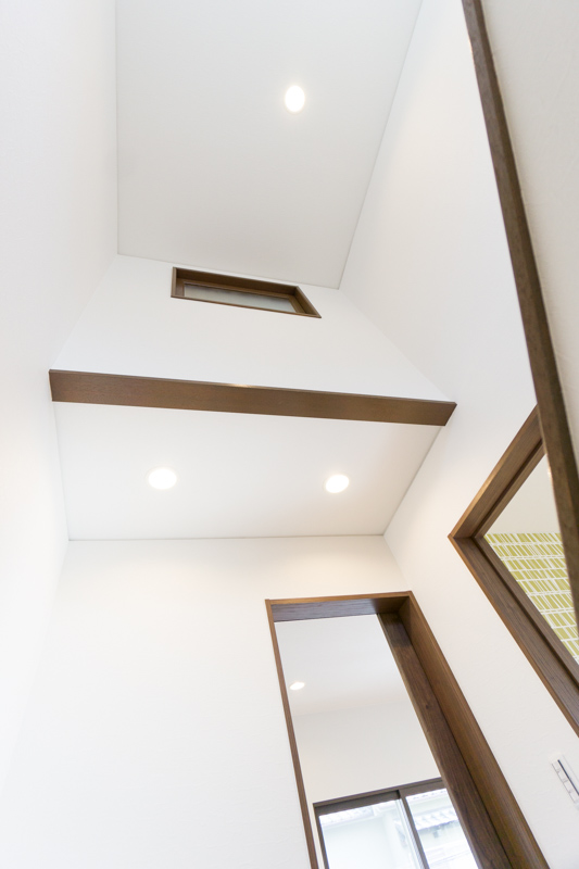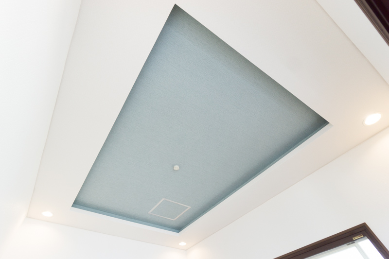 天井もカッコいいやろ?高さを加えて、さらにダウンライトにしてるから広さも感じてもらえると思うで。