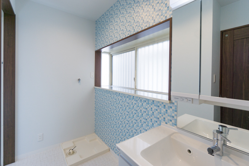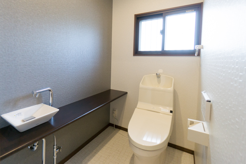 続いて玄関右奥にはお手洗い。スペースは広くとって、洗面台に飾り棚もつけてるよ。