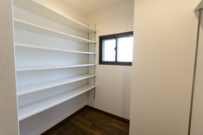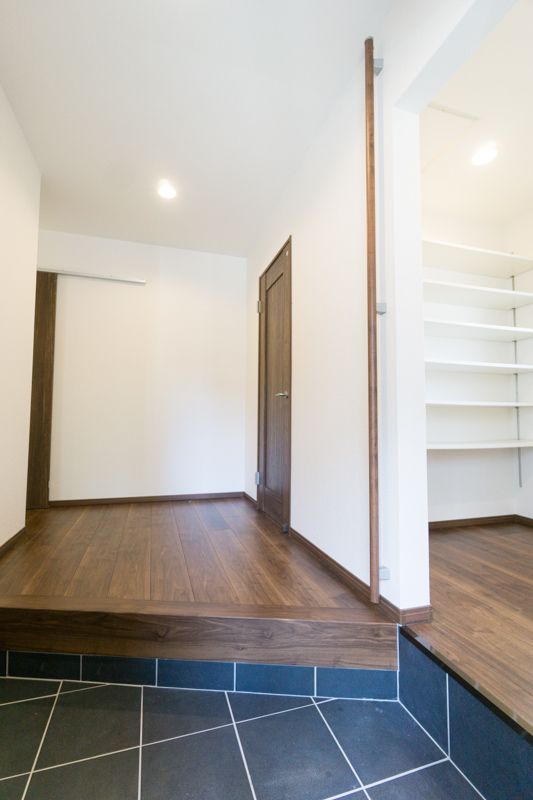 玄関入って右側にはシューズ イン クローゼットを作ってあるよ。靴をたくさん持ってる人も、アウトドアグッズとかベビーカーとかも置ける場所になってるで。
