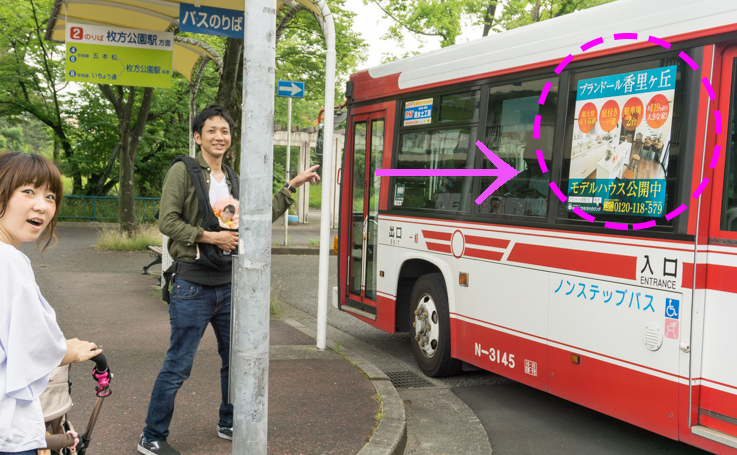 たまたまプランドール香里ヶ丘の写真をつけたバスが停留所へやってきました