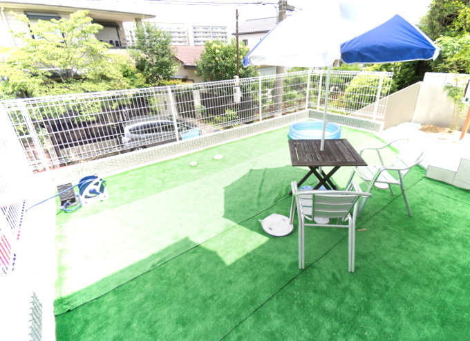 子どもたちをビニールプールに入れてあげられたり、小さな子どもが充分遊べるプライベートガーデンは、敷地面積が43.62坪もある広さならでは!!