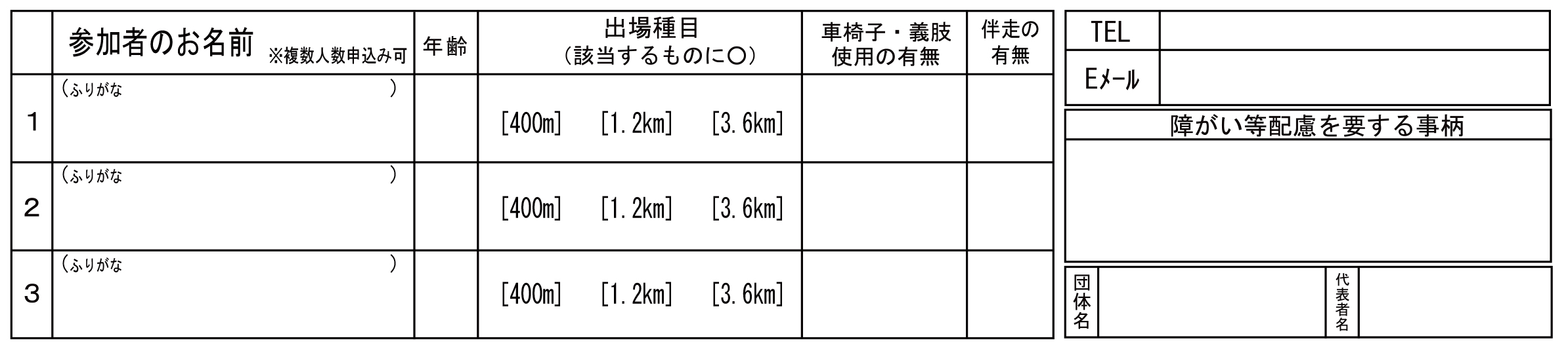 参加者のお名前(ふりがな)・年齢・出場種目(400m・1.2km・3.6km)・車いす、義肢使用の有無・伴走者の有無・障がい等配慮を要する事柄などを明記の上、電話番号、Eメールアドレス、代表者名を記入した用紙を淀川河川公園管理センター(06-6994-0095)までFAXしてください。
