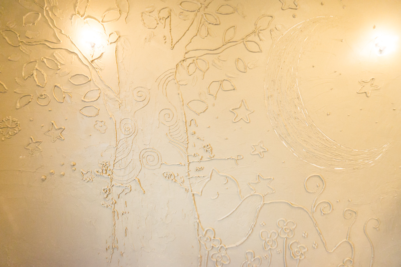 繊細な線で、壁いっぱいにのびのび描かれています。色は着いてないですが、黄緑や黄色、ピンクなど鮮やかな色が目に浮かんでくるような、楽しくってステキな絵です。