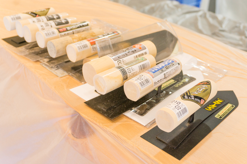 材料ができたらみんなに珪藻土を塗る「こて」と珪藻土を載せる「こて板」が配られました。
