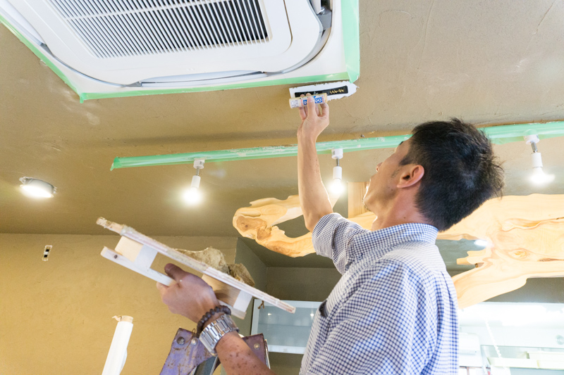 店内は、珪藻土が着いてほしくない場所(床や棚など)が全面ビニールで被われ、ビニールが貼れない場所には養生テープが貼られていました。養生するのに半日かかったそう!おつかれさまです!
