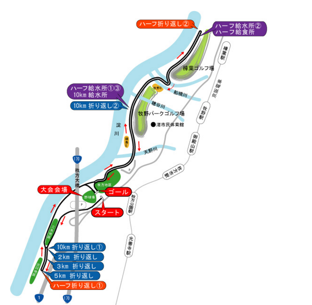 種目(全28種目)によって異なりますが、淀川河川公園枚方地区を端から端まで走ります。