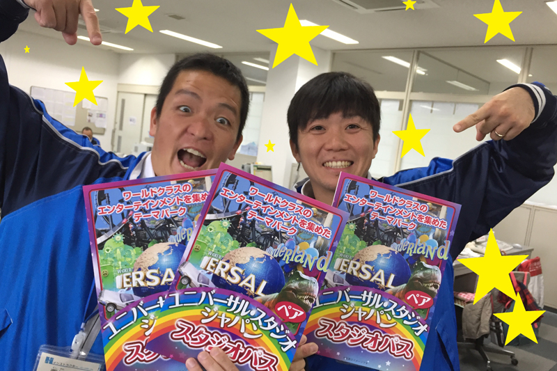 抽選でペア3組6名様にUSJスタジオパスチケットをプレゼント!(写真は左から枚方自動車教習所 指導員の西川さんと藤原さん)