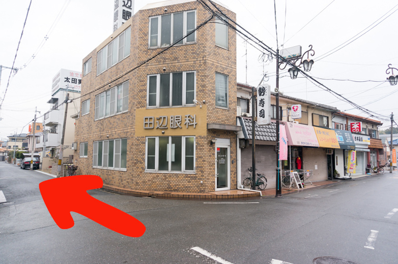 そして田辺眼科が見えたら、矢印の方向へ。
