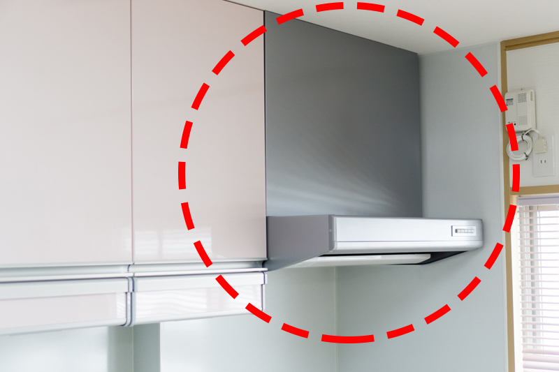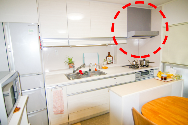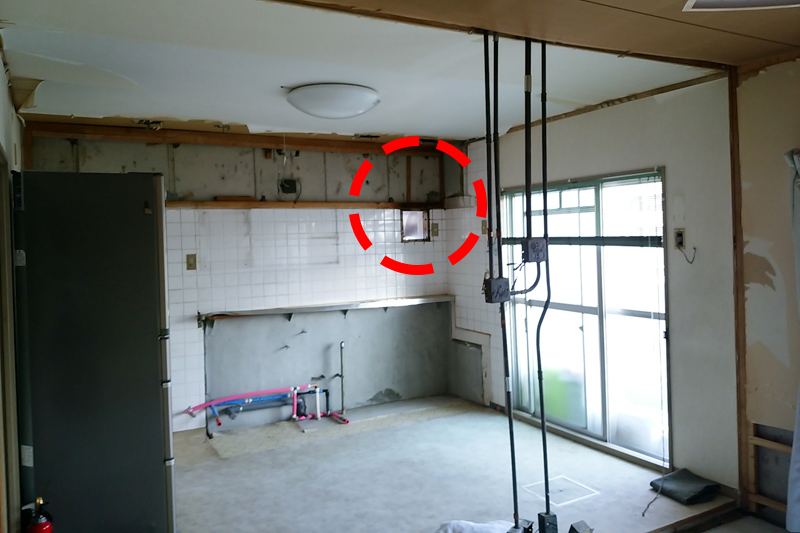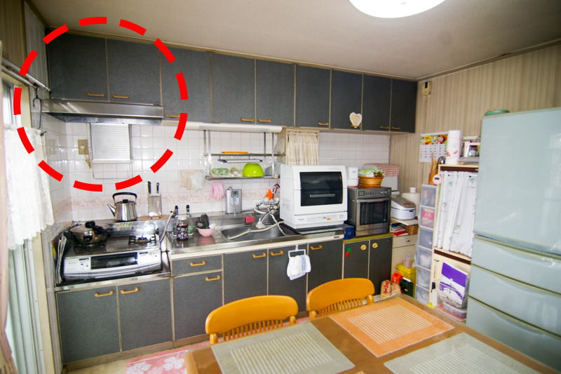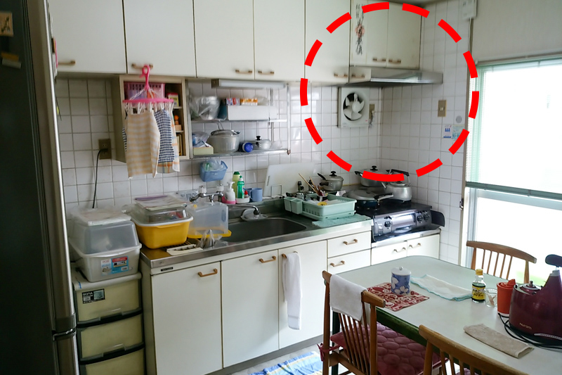 昔ながらのキッチンは、赤い点線丸で示した換気扇もむき出しです。
