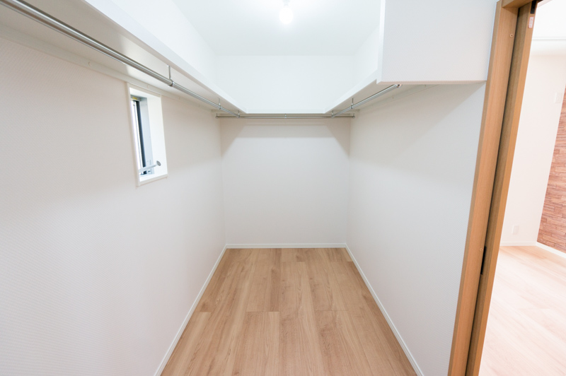 ー 寝室内にあるウォークインクローゼットにはたっぷりの収納スペースがあり、後ろを振り向くと...
