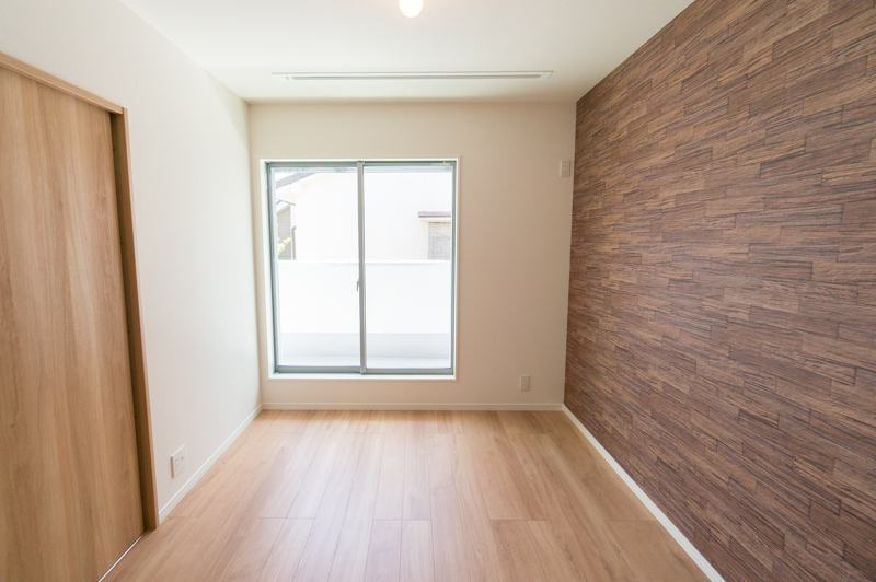 ー 2階にあるこちらの寝室には、壁一面に貼られたウッド調のクロスで落ち着いた空間に。