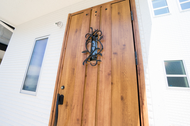 こちらの玄関ドア、木のぬくもりが感じられる色合いと玄関窓のアイアン飾りが素敵でしょう?