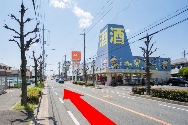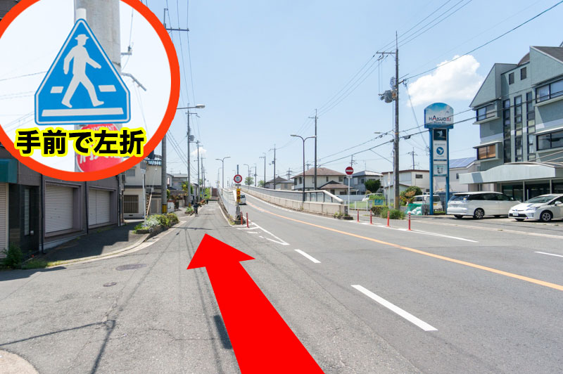 目の前に見えてくる高架道路の手前で左車線へと進み、目印の「横断歩道標識」が見えてきたら左に曲がるとすぐに会場があります。