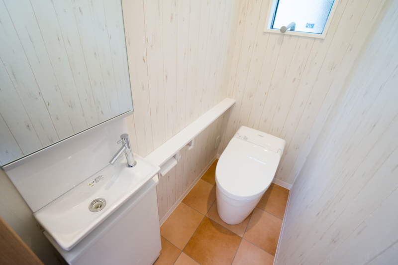 ー 1階にあるトイレは、クロスとタイル調のフロアータイルの組み合わせがおしゃれな空間に仕上がっている。