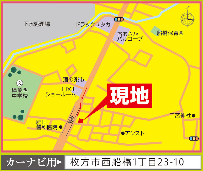 カーナビ入力用の住所は、枚方市西船橋1-23-10です。