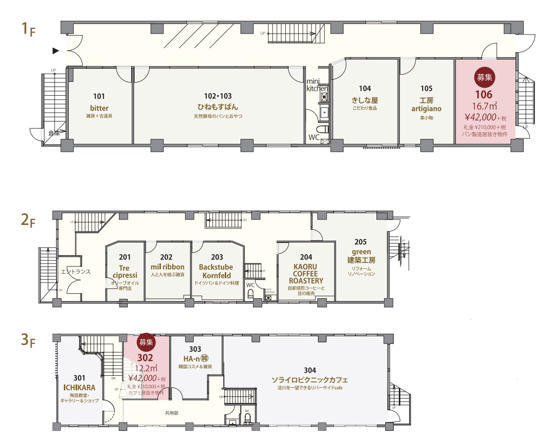 | 賃料(共益費) | ■106号室:42,000円(8,000円) ■302号室:42,000円(8,000円) すべて税別 |