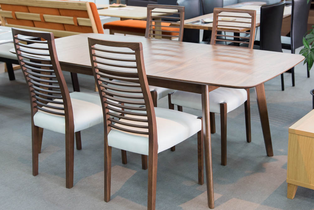 ウォールナットを使用したダイニングセットです。 チェアはお尻の形に合わせて削り込まれており、長時間でも座りやすいつくり。