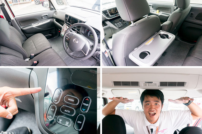 後部座席に向けて取り付けられているナノイー搭載のシーリングファンは(写真右下)、全体の空気を循環させて心地よい車内へ。