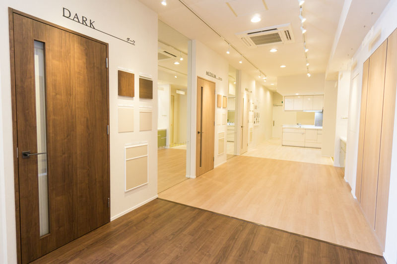 「フローリング見本もカラー別に広く貼っているので、イメージしやすいようになっています。」