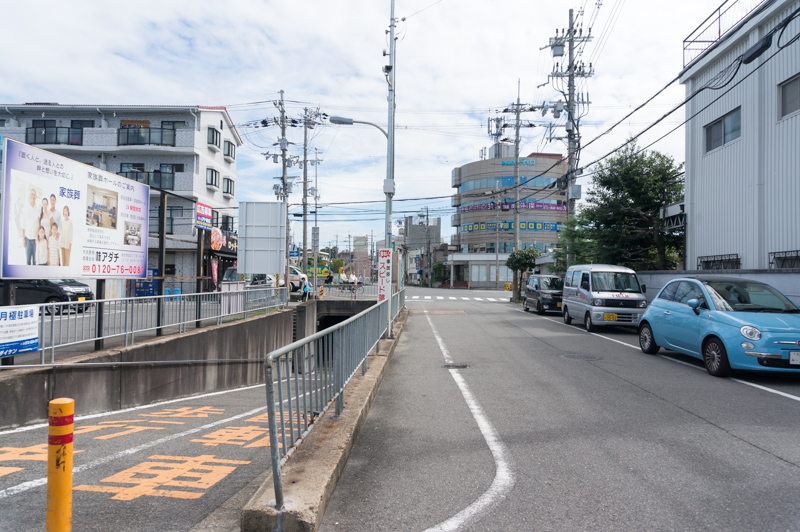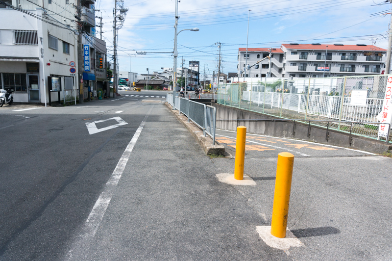 その手前にある黄色のポールが立っている、歩行者と自転車専用の地下道の入り口へ。