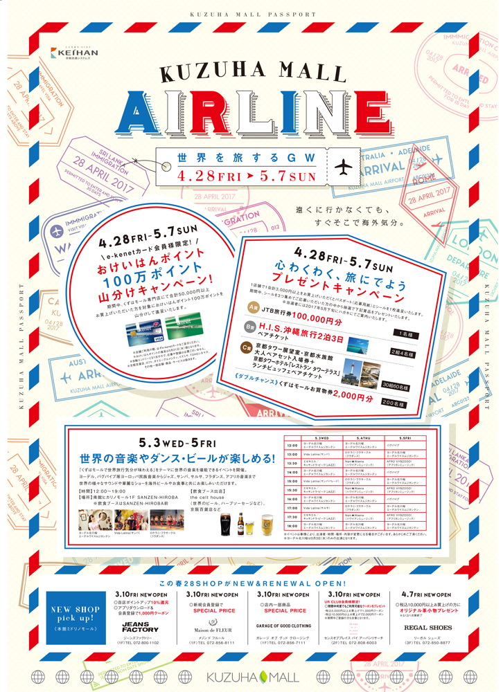 「くずはモールで世界旅行気分が味わえる」をテーマに世界の音楽を堪能できるイベントを開催します。ヨーデル、バグパイプ等ヨーロッパ民族音楽からジャズ、サンバ、サルサ、フラダンス等華麗なショーを海外ビールやお食事と共に楽しんでいただけます。