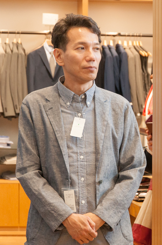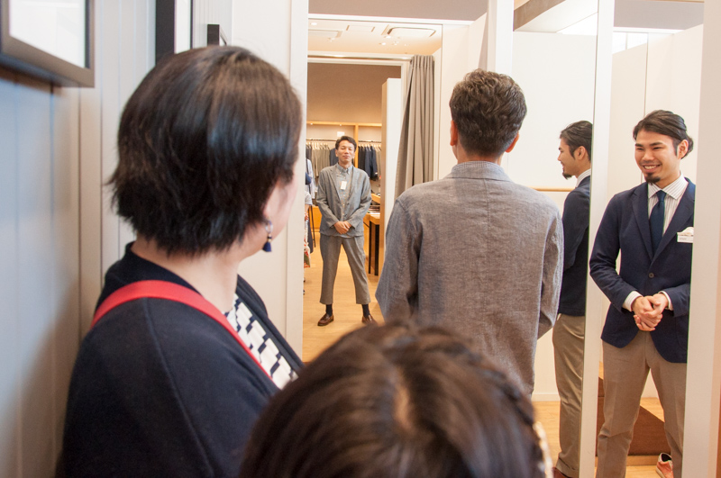 スタッフさん「暑くなったら中のベストを脱いで、白シャツにジャケットを。さらに夏場は白シャツでだけで爽やかに着られます。お持ちの服とも合わせやすいと思いますよ。」