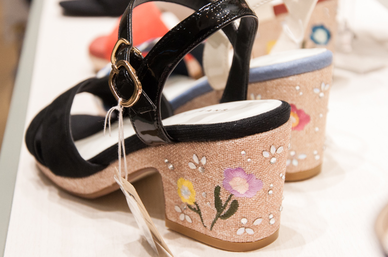 コルク素材のかかとにフラワー刺繍がかわいらしくもあり、大人っぽくもあります