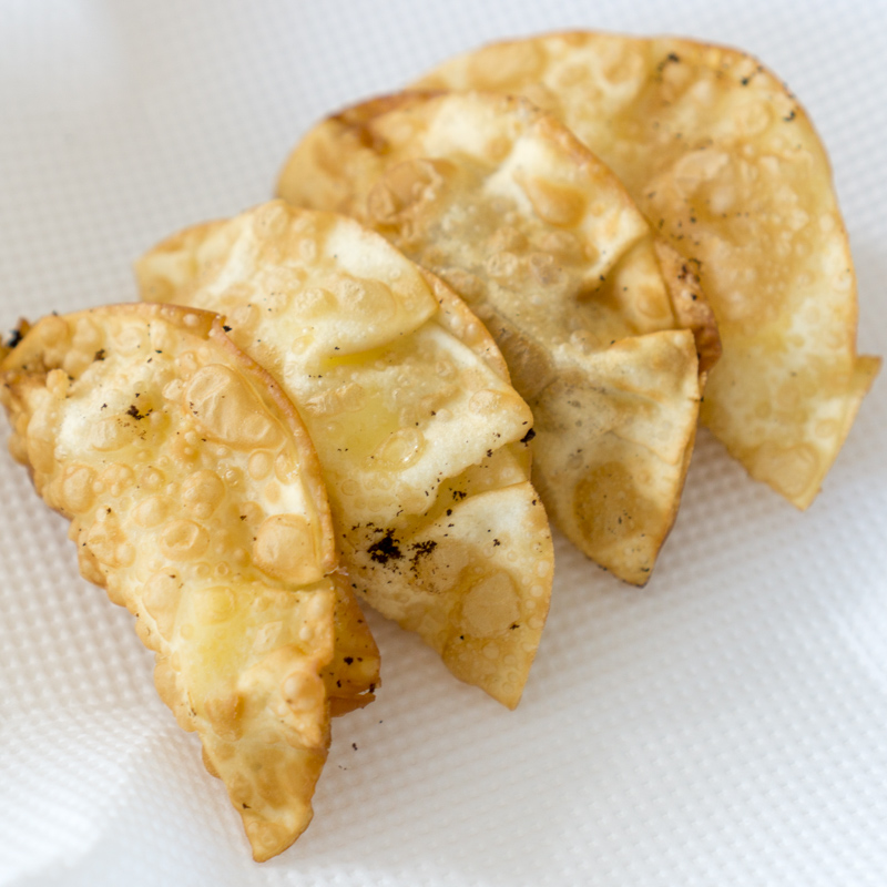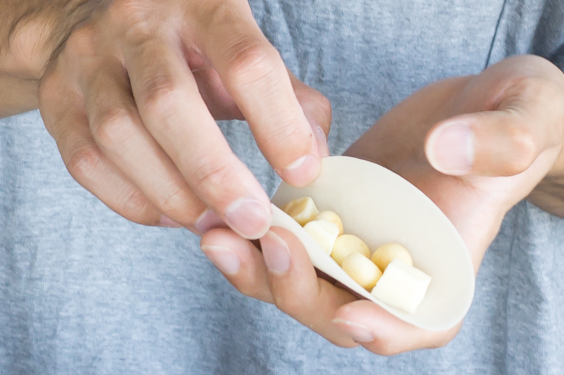 1. 餃子の皮にたまごボーロを適量とチーズを入れ包む