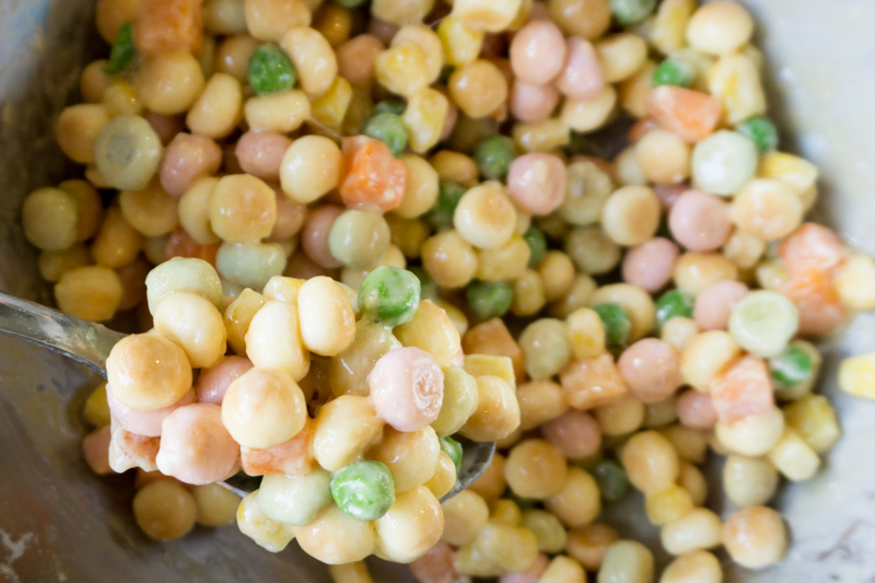 1. たまごボーロを適量入れ、小麦粉と卵黄を加え混ぜ合わせる(お好みでミックスベジタブルを混ぜてもOK)