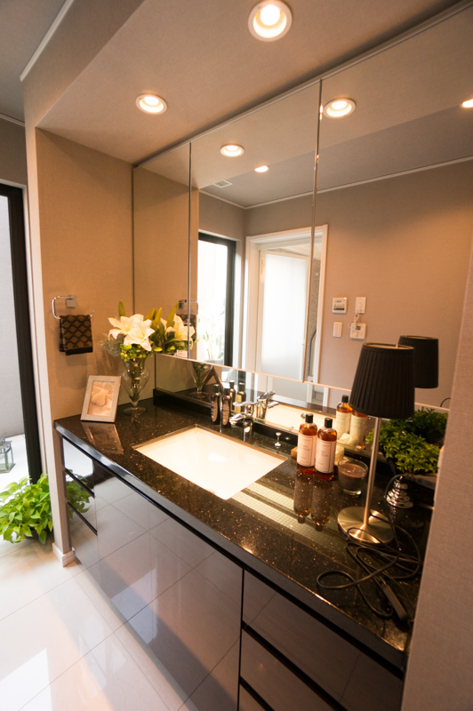 高級ホテルを思わせる洗面所にバスルーム。