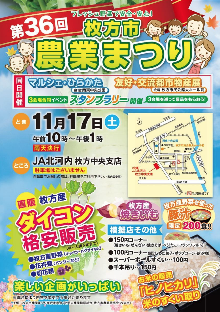 こちらも同日開催の「枚方市農業まつり」では、地元農家が丹精込めて作った新鮮野菜の販売やお米のすくい取りなどが開催されます![]()