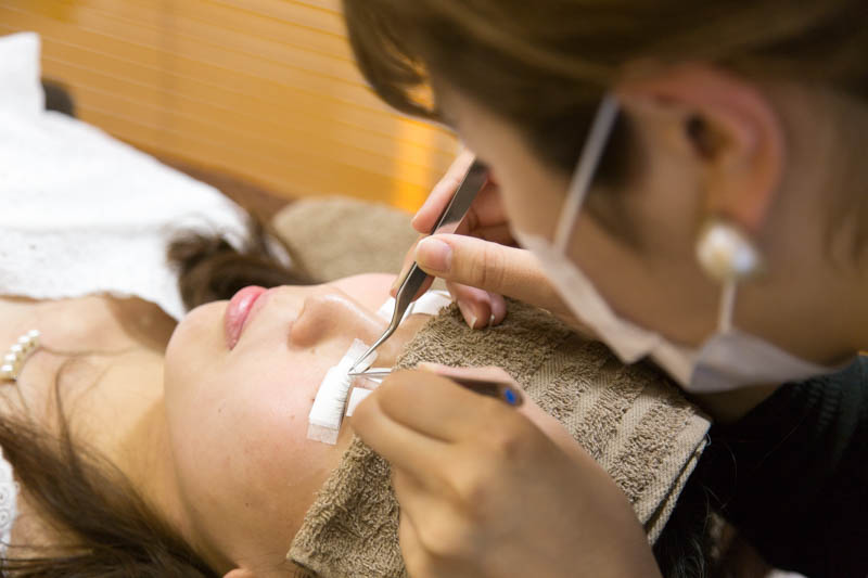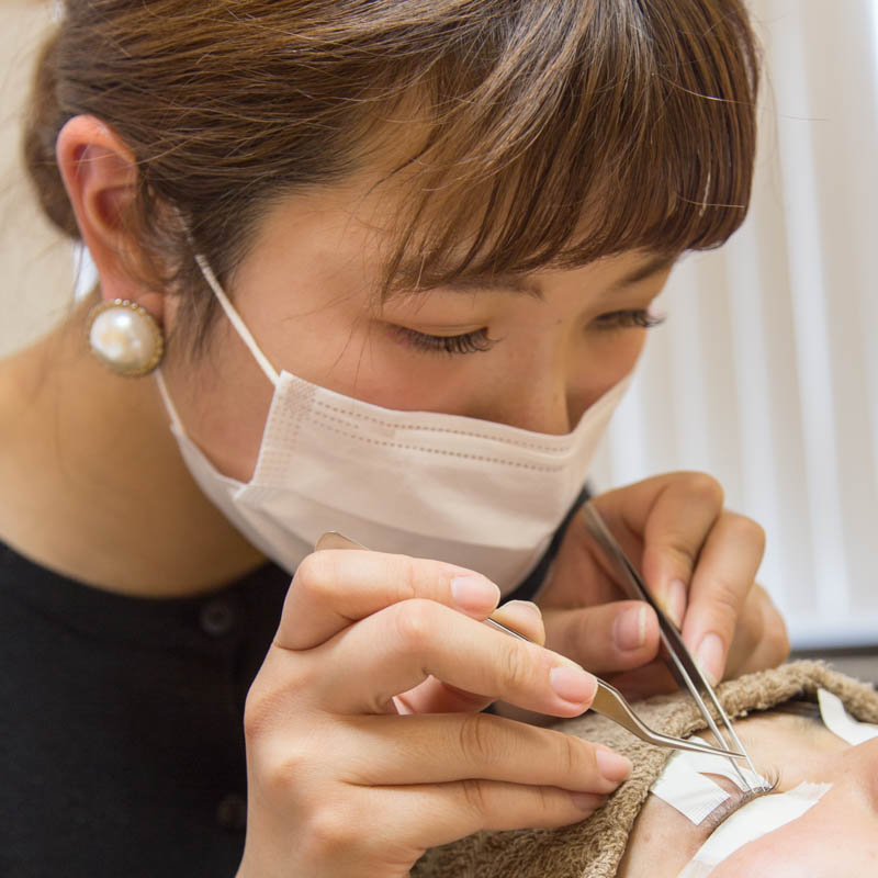 「まつげエクステはまつげの根元から1mmほど離して付けるので、肌には直接触れないので安心してください。施術の際に目の周りに医療用の保護テープを貼るのですが、敏感肌の方だとかぶれてしまうことがあるので、粘着力を弱めてから貼らせていただきますね。」